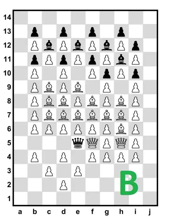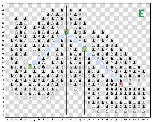 Finally, Component E is a defensive formation guarded by a lonely undefended White Bishop, the only moving piece in the position, which guards the marked pawn on Ez8, which controls a trapped Black Queen. In the position pictured above, assume that the Black Rook is on the square En26 threatening the White Bishop on En20. Assuming that White does not answer the threat, Black will free the Queen by playing 1...RxEn20 2...REn1 3...REaf1 4...REaf8 5...RxEab8 6...RxEz8 7...QEy9 8...QEs15 or QEn20 9...Black Queen checks the White King, i.e. Black again threatens perpetual-in-9. Thus, White is best advised to move his Bishop out of the way. The movement of the Bishop is quite restricted, in fact it can only ever visit the three unguarded squares marked in green: Ef12, En20 and Er16 (the latter two squares have a view of the important pawn). In the situation from before with the Black Rook on En26, the White Bishop should move to the right, i.e. BEr16, because moving to the left would simply result in a repetition of moves, i.e. 1.BEf12 REf26 2.BEn20 REn26, since the left green square can only be attacked from the North while the right green square can only be attacked from the South. Thus, conversely, if Black were to threaten the White Bishop from below, then the White Bishop has to move away to the left under cover, since any capture of the Bishop on any of the three green squares results in perpetual-in-9.