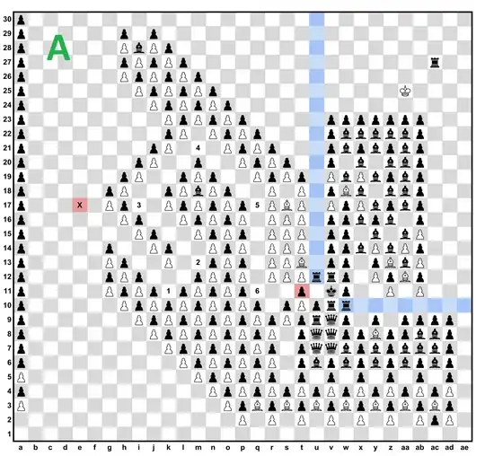 There are a few noteworthy observations about this fortress: First, the White King's movement is restricted to the top right quadrant of the board by the pinned Black Rooks. Thus, if Black were to move his free Rook north and start giving checks, then White would be unable to hide his King - he would be forced to move his King north to meet the Black Rook and push it away. Secondly, White can checkmate the Black King by capturing the highlighted Black pawn on At11 with his Queen (which is the only White piece that can freely move around the entire board, as we shall see). The numbers in the position show the path that the Queen has to take through the twisting corridor in order to reach the checkmate square: If the White Queen starts from immediately outside the corridor on the red highlighted square marked with an X (Ae17), or any other outside square on the entrance diagonal, then she will need 7 moves to checkmate Black. Keep this number in mind as the game will critically depend on every single tempo. Finally, note that the entrance diagonal into the corridor is quite obstructed - the pawn wall to the left as well as the Northern and Southern Barriers completely block off any immediate access from the West or from the vertical files Ab through Af into the corridor.