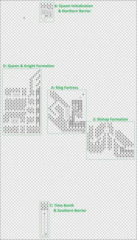 Now let's examine how White can answer this threat: The White Knight on Do16 (marked in orange) can defend the incursion squares II and III by jumping between the two orange squares Do16 and Dp18. Other than that function, this Knight has no freedom of movement. The White Queen can defend the incursion squares I and IV (as well as Iβ and IVβ) from afar by moving between the rows D8 and D26. Note that this suffices as a defense despite the incursion squares I and IV being defended by Black pawns, since a trade of the Queen for the Rook is a victory condition for White, as discussed above (Black can only move pawns to no effect while White slowly releases his Queen in Component C). Finally, the four White pawns on Dg7, Dh7, Dh25, Di25 (marked in blue) have the sole function of preventing an incursion by the Black Rook from the West. For instance, if the Black Rook moves to Da8, then White can defend the incursion with Dg8. Other than that function, these White pawns can make no further progress.