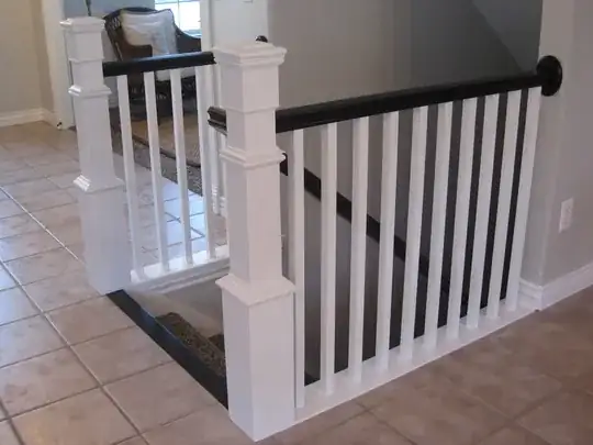 My first problem is that I've been unable to even search for replacement items, because I'm at a loss for how to describe these top-of-stairs-sawn-off-stairwell-side-rail-ettes. Can anyone tell me what they're called, point me in the right direction to shop for replacements, and/or supply any further advice on how to construct something better in the limited space available?