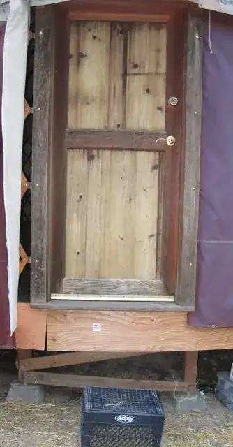 The deck is 32" above grade. Eventually I'll build a landing / small deck, but I'm too busy with other projects right now (like closing in the yurt wall canvas!)