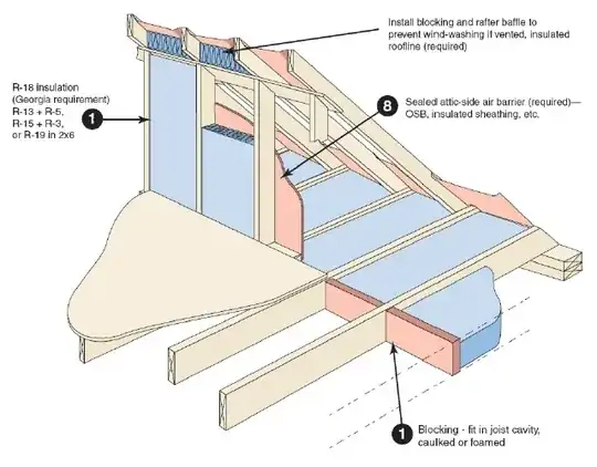 Where is says "Install blocking and rafter baffle...", the vaulted ceiling in the conditioned space adjacent to the knee wall, is open-cell foam. Therefore, I'm concerned that not providing a clear air path from eave to ridge vent would cause moisture buildup even if I had baffles along the rafter. Right now supposedly it's not a problem because part of the knee wall attic does have airflow (it's not regularly shaped), but if I restrict the channels to between the rafters only, about half of them are blocked by the vaulted ceiling's foam barrier.