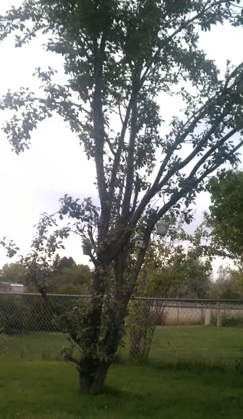 My mom thinks it's a Mirabelle plum tree (Prunus domestica), but those appear to produce orange plums. It's in southeastern Idaho, gets full sun from about 9 AM until sunset.