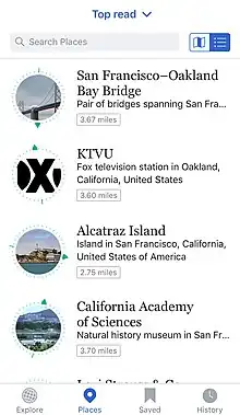Screenshot of Wikipedia iOS app - shows places around Wikimedia Foundation HQ - Wikipedia Mobile Apps use this API to show nearby locations. API usage can be seen in the source code of Android and iOS app