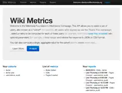 Wikimetrics is a webtool (formerly known as UserMetrics) designed to simplify the measurement of on-site user activity based on a set of standardized metrics. Using this tool, different metrics can be selected and applied to an arbitrarily defined group of users (called a cohort) to measure their overall productivity, retention, quantity and quality of wiki work. The platform is language- and project-agnostic (it can retrieve data from any Wikimedia project), extensible (adding new metrics, modifying metric parameters) and designed to make data collection for various types of cohort analysis and program evaluation more user-friendly.