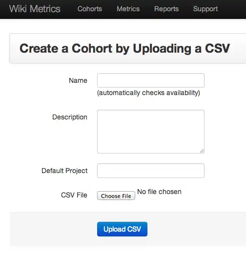 - Navigate to the "My Cohorts" screen then click the “Upload Cohort" button. The "Uploading " screen looks more or less like this: