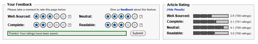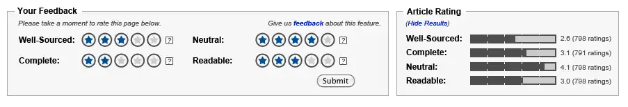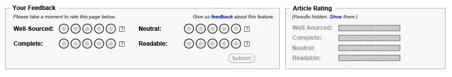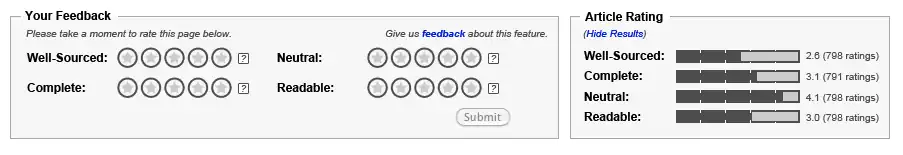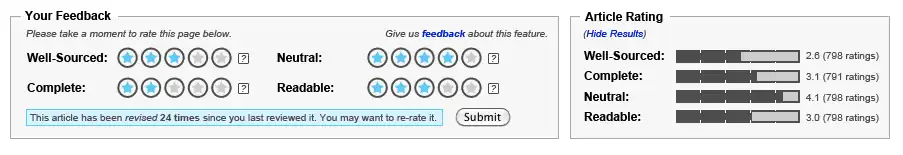 Ideally, the two sections will not be placed in close proximity on the page. However, several factors prevent this from occurring during the pilot (including but not limited to expected resistance from readers and editors to placing the Rating Display box in a more prominent position).