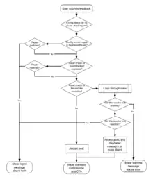 If the user hits the submit button, it runs an error check and, if there are no issues, invokes an AJAX request. Upon successful return, the form is replaced with a CTA (call to action), which is also chosen via bucketing ($wgArticleFeedbackv5CTABuckets).