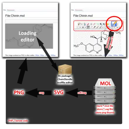 .molfile (existing or non-existing file) - Client loads molfile editor. Editor allows import/export of molfile, export of SMILES and export of SVG (server created SVG).