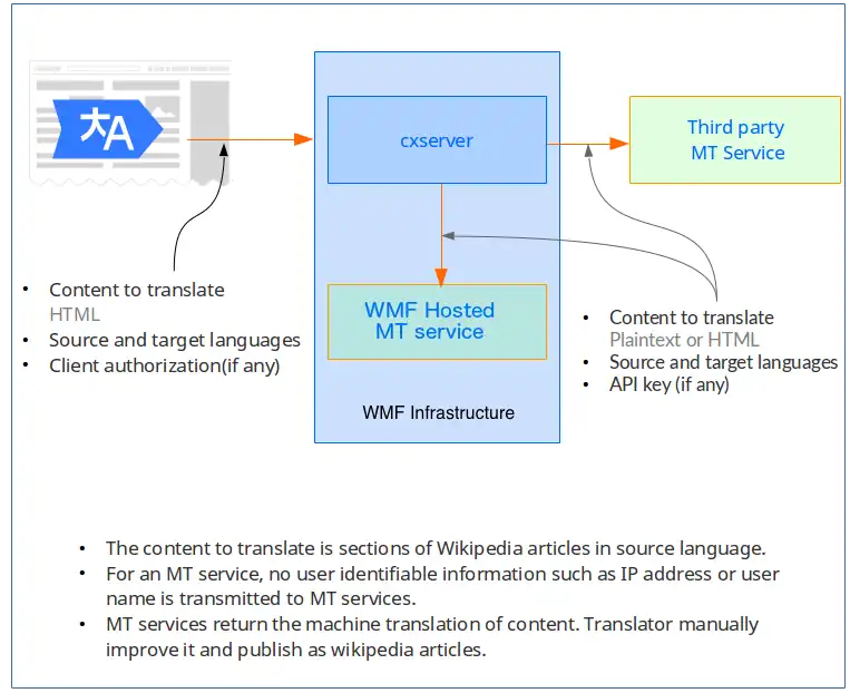 A machine translation API takes source language, target language, source content and outputs translated content.