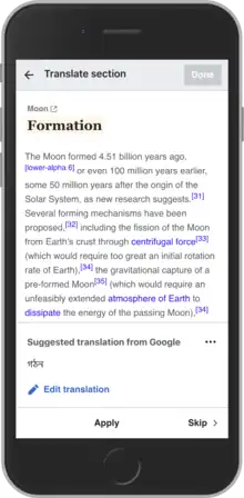 - Content translation enabled by default for Tagalog, Central Bikol, Malayalam, Bengali, and Mongolian Wikipedias.