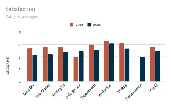 Respondents were asked to rate their satisfaction with several broad areas of our developer tooling and infrastructure. Each area was given a rating of 1 (very dissatisfied) to 5 (very satisfied). This was followed by several free-form questions which solicit feedback in the respondent's own words. The satisfaction ratings have been summarized by taking the average of all responses in each category.