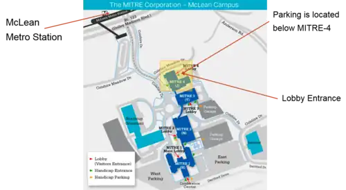 When you get off the train platform, you can see MITRE 4, the building where the event will occur:
