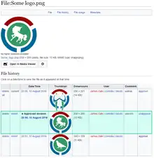 You can also approve file revisions with Approved Revs. It should be noted that only revisions to the actual file are approvable; revisions to the wikitext of the file pages are not. As such, approval of files is not done by clicking the "view history" link in the top-right of the file's page. Instead, scroll to the "File history" section near the bottom of the file page, and click "approve" on the right of the file history table.