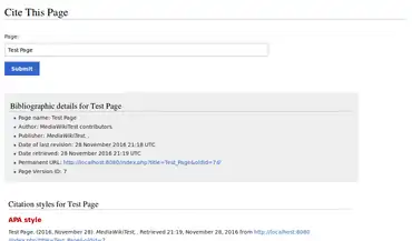 The CiteThisPage extension, previously known as SpecialCite.php, is an extension that creates a special page (Special:CiteThisPage) and toolbox link to it for pages in the main namespace.