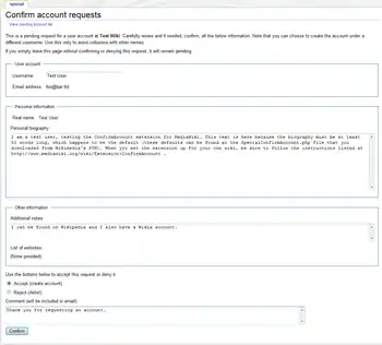 - If you chose to create the account, the user's biography will become their userpage and the userpage will be automatically created with the default summary of Creating user page with biography of new user.