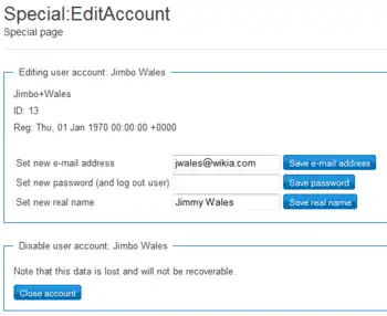 The EditAccount extension has two main purposes. One is to change the password, real name, or email address of another user. The second is to disable the account of another user.
