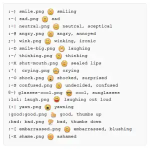 :-) smile.png smiling :-( sad.png sad :-| neutral.png neutral, sceptical :-@ angry.png angry, annoyed ;-) wink.png winking, ironic :-D smile-big.png laughing :-/ thinking.png thinking :-X shut-mouth.png sealed lips :'( crying.png crying :-O shock.png shocked, surprised :-S confused.png undecided, confused 8-) laugh.png laughing :lol: glasses-cool.png cool, sunglasses (:| yawn.png yawning :good: good.png good, thumbs up :bad: bad.png bad, thumbs down :-[ embarrassed.png embarrassed, blushing [-X shame.png ashamed