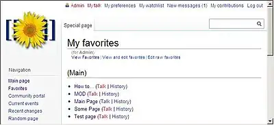 This extension also creates a new Special page called "Special:Favoritelist". This special page allows users to view or edit their list of favorites. A link to this page can be added to the Personal Urls section of MediaWiki. See Configuration parameters for more details.