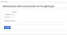 The list of domains, which are allowed to login with Google, are managed in an array in the LocalSettings.php (the $wgGLAllowedDomains configuration option). Since version 0.4.0, GoogleLogin also provides a way to manage the list of allowed domains on the wiki itself. The allowed domains are saved in the database when this feature is enabled and can be change (remove/add) through a graphical user interface (a special page) or through the MediaWiki API.