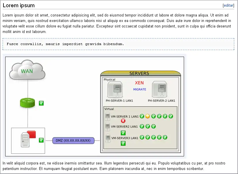 NagVis is an extension for add NagVis maps to MediaWiki pages. Icons map will be updated automatically and status will be pull from Nagios/Icinga/NagVis servers.