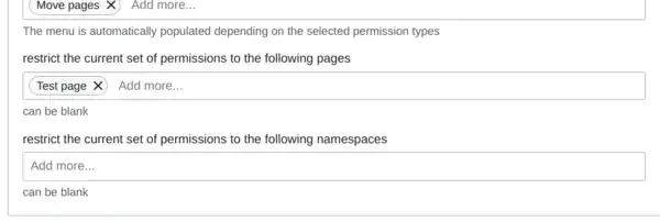 When accessed from the list of Special Pages, the Set permissions form also features two inputs to restrict the current set of permissions to specific page(s) and to specific namespace(s).