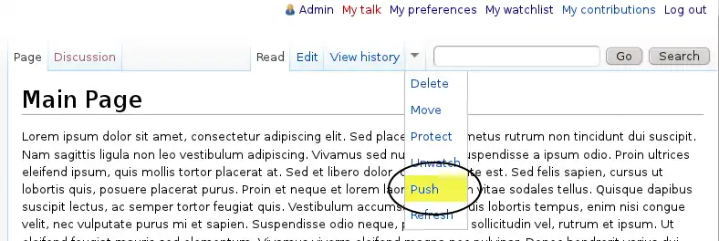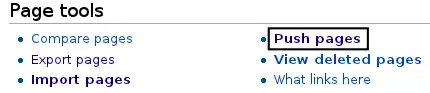 The primary interface to push pages from one wiki (the source) to another (the target) can be accessed as a tab, in much the same way as the editing and page history interfaces.