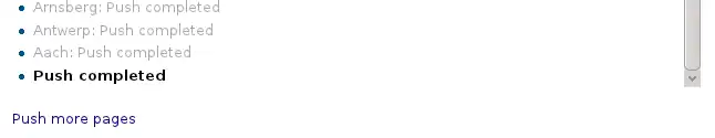The push process can be started by hitting the "Push pages" button. When doing this, the page will reload and show what pages it's pushing. As the process goes along, a list of pushed pages is build up, keeping track of potential problems per page. If there is such a problem, the line will be colored dark red, if the push is successful, it'll turn grey and state "Title: Push completed".