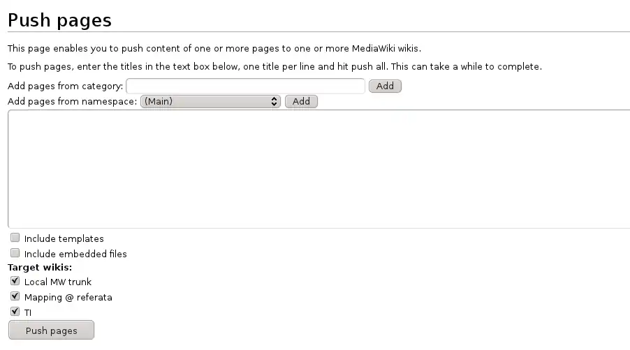 The interface is centred around a big text field in which you can specify the pages you want to push, one page name per line. This is similar to how Special:Export, MediaWikis built-in export facility, works. Directly underneath the text field are the options to include embedded files and templates, which behave identically to the ones found in the push tab interface. At the bottom of the interface is a list of target wikis you can push to. Check or uncheck the checkboxes to indicate which wikis should be pushed to.