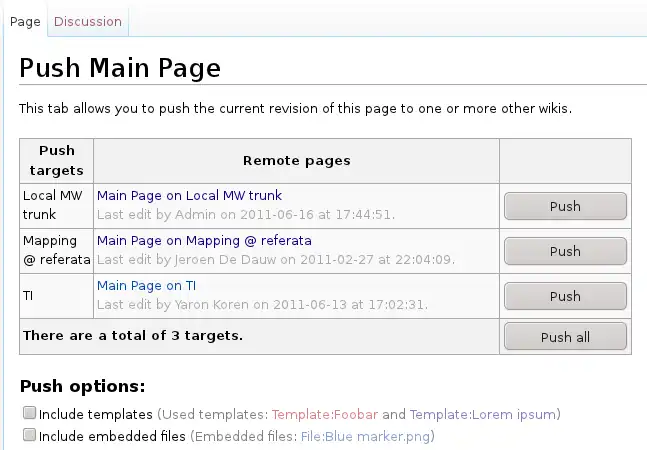 Each target wiki has an associated button that allows pushing the page to that wiki. In case there are multiple target wikis, a "Push all" button will also show up at the bottom of the table, which enables you to push the page to all target wikis with one click. After the page is loaded Push will poll the target wikis for useful info on the current state of the page there and display it under a link to the page. This makes it easy to assert if the page already exists there, and if so, who last edited it, and when. You can use the link to the page on the target wiki to further inspect the page if needed, or view the result after doing the push.