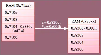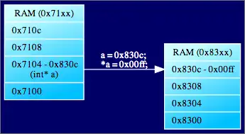 <quickgv name="Pointer4" usage="ram" theme="sakura"> A [label="RAM (0x71xx) | 0x710c\l | 0x7108\l | <fsrc> 0x7104 - 0x830c\l (int* a) | 0x7100\l "]; B [label="RAM (0x83xx) | <fdst> 0x830c - 0x00ff\l | 0x8308\l | 0x8304\l | 0x8300\l"]; A:fsrc -> B:fdst [label="a = 0x830c;\l*a = 0x00ff;\l"]; </quickgv>