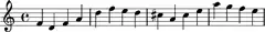 <score>\relative c' { f d f a d f e d cis a cis e a g f e }</score>