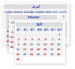2 February 1972, but can be adjusted by supplying a PHP date format in the format parameter. See PHP Manual - strftime for details about how to specify a date format. - dayformat — This sets the format of the titles of each day of the week at the top of the month tables. The default setting is M T W T F S S, but can be set to %a for abbreviated names in the current language such as Mon Tue..., or %A for full names in the current language.