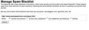 By inserting a link on each diff page, if an editor sees that a given page has been the victim of spam, they can click on "add to spam", which extracts all of the URLs the spammer has placed on the page, going back over their most recent edits on the article (similar to Rollback). Then, for each URL detected, the tool prompts the user the degree to which they want to blacklist the URL. The options are block:
