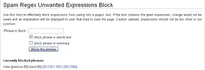 The SpamRegex extension creates a new page, "Special:SpamRegex", to filter out unwanted links or text. A full list of currently blocked links or text can be viewed on this same special page. The spamregexed expressions cannot be used in page content, edit summaries or page move summaries, depending on what was chosen by the user who blocked links or text.
