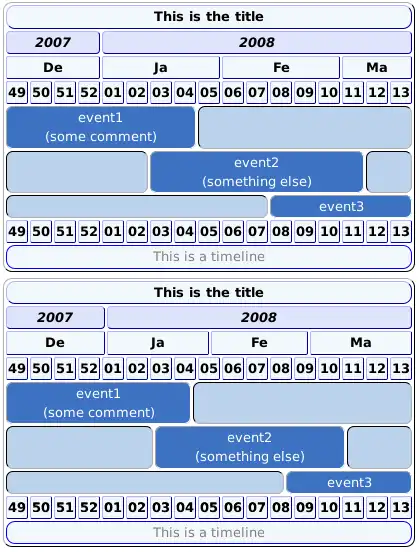 <timelinetable title="This is the title" footer="This is a timeline" depth=week headers=Y/M-M-2/W footers=W> 2007-12-05|2008-01-26|event1|some comment 2008-01-15|2008-03-10|event2|something else 2008-02-23|2008-03-29|event3 </timelinetable> <timelinetable title="This is the title" footer="This is a timeline" depth=day headers=Y/M-M-2/W footers=W> 2007-12-05|2008-01-26|event1|some comment 2008-01-15|2008-03-10|event2|something else 2008-02-23|2008-03-29|event3 </timelinetable>