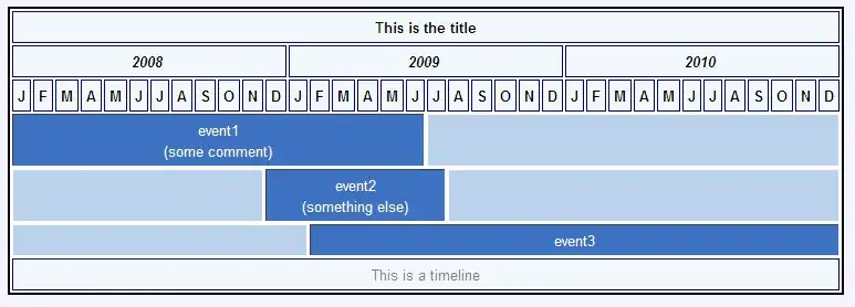 This will generate a html table with three rows (one per event), and a column for each month from the first month of the earliest event to the last month of the last event.