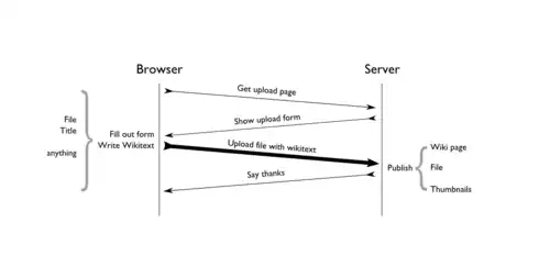The file is uploaded with an HTML form, along with wikitext for the File: page that will surround the image.