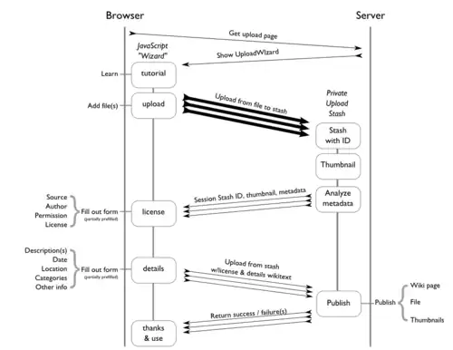 UploadWizard at heart uses the same system -- associate a media file with wikitext. But it adds two new layers to the entire interaction.