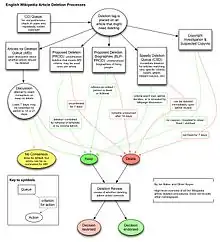 | Articles for deletion (AFD) | Nominator creates a page under AFD for the discussion, adds a template to the top of the article, and notifies related WikiProjects and substantial contributors to the article. Deletion discussions run at least seven days, during which editors vote to keep, delete, etc. Any editor can close the discussion after consensus has been determined, but certain closing actions (such as deletion) require administrators. Deletion discussions are archived by topic for future reference by WikiProject Deletion Sorting. |