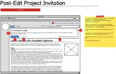 - After X edits to articles in a project's "umbrella" a dialog is loaded with an invitation: