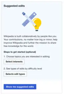 - We will also be designing and prioritizing a test that makes suggested edits the clear focus on the homepage, attempting to encourage more users to enter its workflow.