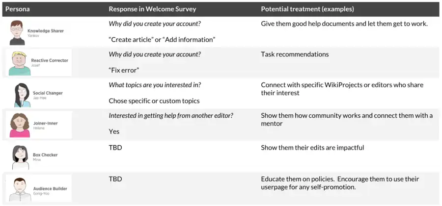 The New Editor Experiences research identified six personas that most newcomers fit into. Those different personas have different skills and different goals, and we can increase retention if we develop an experience that is attuned to the persona of each editor. For instance, if we think a newcomer is a "Reactive Corrector", we might recommend a set of corrections to make. Our welcome survey questions are not granular enough to precisely classify newcomers into personas (that would require a much longer survey), but they give us some good information to work with. The table below shows an example of how we're thinking about this. Each row shows one of the six personas, along with a response from the welcome survey that might help us identify them, and a treatment that might go with that persona to help them be retained.