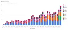 - Similarly to the graph of edits, this number also has increased steadily, and the addition of new wikis (such as French Wikipedia on week 21 and Persian Wikipedia on week 32) are clearly visible.