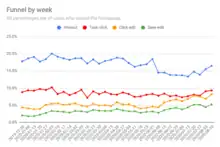 Conversion funnel: the first graph is the most important to our team. Each line shows how many newcomers arrive at each stage of our "conversion funnel", meaning how far they progress into the newcomer tasks workflow, as a percentage of newcomers who visit their homepage. We want the users to move through the stages of (1) interacting with the module (blue), (2) selecting an article (red), (3) clicking edit on the article (orange), (4) saving an edit (green). In general, we want to see all the lines go up.