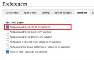 Add pages the user edits to their watchlist, checking the "Watch this page" by default on all edited pages. This option can be disabled by editors in Preferences → Watchlist tab → Watched pages section and unchecking "Add pages and files I edit to my watchlist" | ||