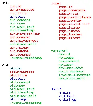 In the 1.5 model, revision metadata and revision text were split: the cur and old tables were replaced with page (pages metadata), revision (metadata for all revisions, old or current) and text (text of all revisions, old, current or deleted).