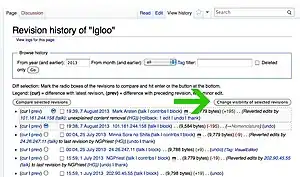 When a user with the 'deleterevision' permission (see Enabling section) views a history page, they will see an extra button on the page that says "Change visibility of selected revisions". They will also see checkboxes next to all the revision entries on the page. If they select one or more revisions and click the button, they will be presented with an interface allowing them to do any of the following: