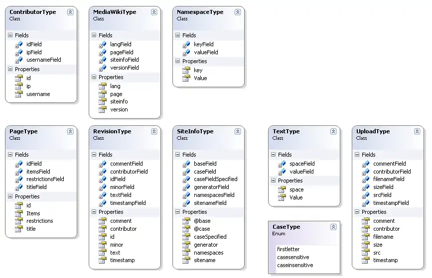 First, download the MediaWiki schema at https://www.mediawiki.org/xml/export-0.3.xsd. Place the schema file in a .NET project folder, and consider renaming the file to something more intuitive such as MediaWikiExport.xsd. Using Visual Studio.NET's xsd.exe tool, you can generate a .NET class file based on this schema using this VS.NET command line prompt: