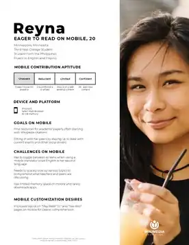 The United States Mobile Personas is a Wikimedia Foundation project aiming to evaluate mobile readers and contributors' assumptions, behaviors, interactions and reactions to the various modes of interaction users can have with Wikipedia on mobile. Mobile personas were ultimately created after analysis and synthesis of collected user data points and experiences.